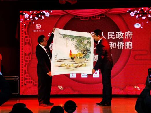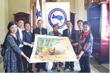 (图:雷玉春副市长向巴拿马省长赠送清远鸡国画)
