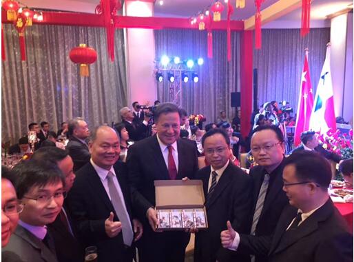 北京时间2月2日,巴拿马中国大使馆新春招待会,巴拿马巴雷拉总统应邀参加并致辞,并观看了来自清远连州壮族的舞蹈表演。招待会上,雷玉春副市长向巴雷拉总统介绍清远,雷副市长将飞霞液赠送给巴雷拉,巴雷拉对飞霞液的包装颇感兴趣,他说他也有一间酒厂,并表示今年有可能到访中国。雷玉春说,如果到访中国,我们热烈欢迎总统来清远做客。