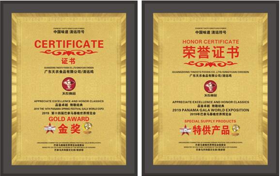 广东天农食品有限公司作为清远鸡龙头企业,旗下原种清远鸡产品在所到之处成为关注焦点,为海外侨胞及外国友人带去原汁原味的“清远味”和安心愉悦的美食体验。公司及特供产品荣获由巴拿马春晚组委会、巴拿马共和国文化部及旅游部联合颁发的“金奖”及“特供产品”两大奖项。