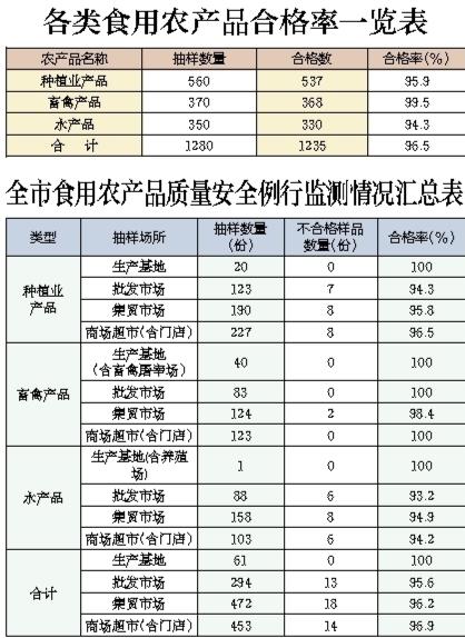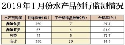 根据《关于印发2019年深圳市食用农产品质量安全例行监测方案的通知》(深市质〔2018〕688号),深圳市市场监督管理局1月份在全市范围内的71个食用农产品生产、经营场所抽检食用农产品1280份,其中种植业产品560份,23份不合格;畜禽类产品370份,2份不合格;水产品350份,20份不合格。检测不合格的产品均已实施了后续处理。