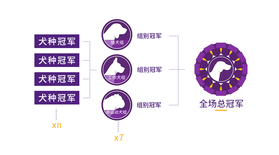 同以往一样,每一届西敏寺犬展的全场总冠军之路都是一次充满挑战的征途,每一只来到这个赛场的犬只都将首先面对同犬种选手的挑战,在犬种之争中胜出的犬只(单犬种冠军——B.O.B)将与同组别不同犬种的其他冠军一决高下,决出犬组冠军(B.I.G),之后再带着本组的荣光,与其余6只犬组冠军争夺代表着这项赛事最高荣耀的全场总冠军(B.I.S)。