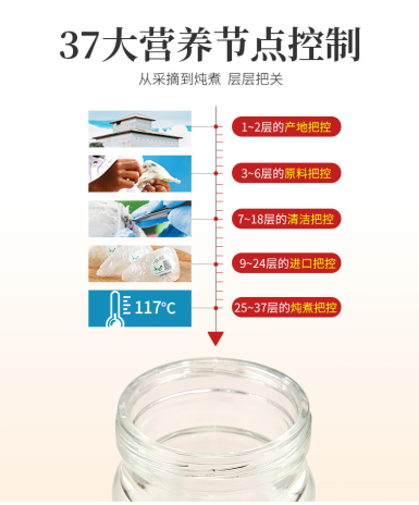 5.原瓶鲜炖,全程控温:分段攀升杀菌温度,精准控制燕窝炖煮时点和状态,保持天然燕窝炖煮口感。