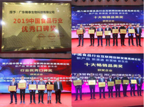 广东椰泰在荣幸参会的同时凭借不凡的实力实现品牌破茧,获得了由“食品视界新媒体平台、中国食品招商网、中华名酒招商网”联合授予的“行业优秀口碑奖”、“十大畅销品类奖”的品牌殊荣。