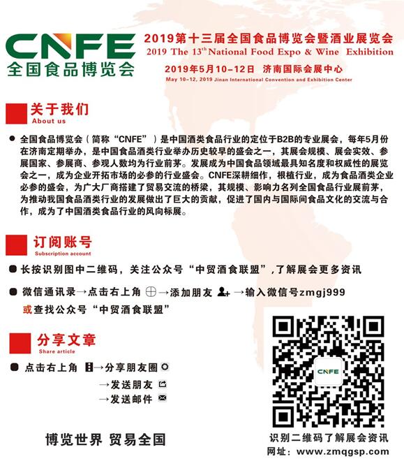 备受行业瞩目的2019第13届全国食品博览会暨酒业展览会(简称CNFE)将于2019年5月10日在美丽的泉城济南绽放.展会以“博览全国,贸易世界”为主题,倾力打造山东乃至北方规模最大、品类最全的食品和糖酒类旗舰大展!目前,本次盛会各项筹备工作正在有条不紊的进行当中。