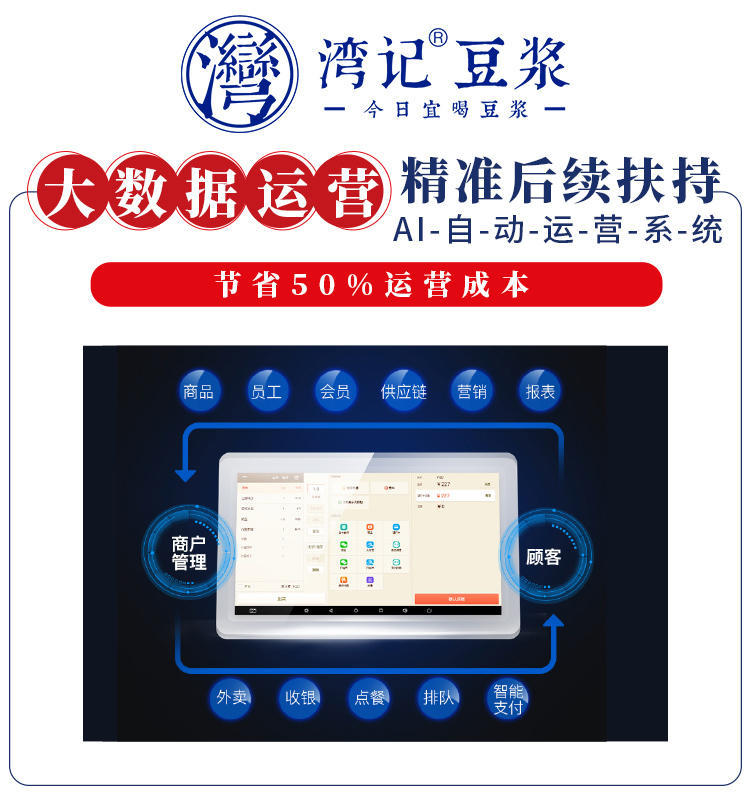 值得一提的是,湾记豆浆考虑到餐饮行业一直饱受高人力成本、低效率的经营压力。率先引入AI店铺运营系统,通过扫二维码一键点餐、结账,不仅提高了点餐效率,让消费者再也没有等点餐的苦恼,更节省了60%人工成本。除此,湾记豆浆已和多家外卖平台达成战略合作,依托成熟的外卖系统和大数据运营支持,湾记豆浆实体店收入可额外增收40%。