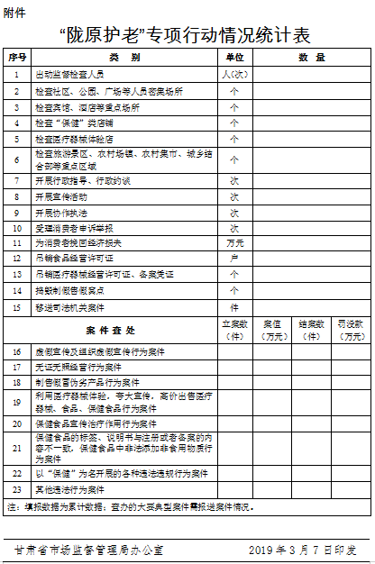 (五)及时报送信息。建立“陇原护老”专项行动信息报送制度,每月15日报送前一阶段“陇原护老”情况统计表(附件),2019年11月20日前报送本地开展“陇原护老”专项行动的有关情况(包括整体情况、主要措施、存在的问题、下一步工作安排等)。