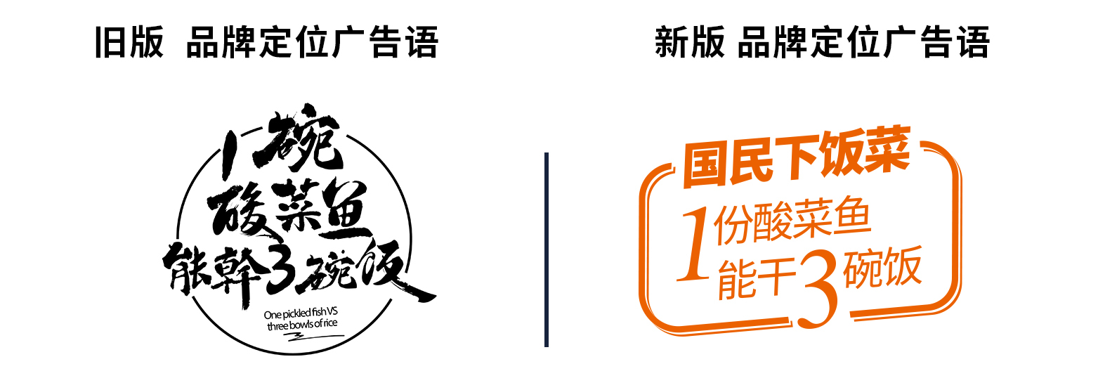 “鱼你在一起”品牌定位广告语由“一碗酸菜鱼,能干3碗饭”升级为“国民下饭菜!1份酸菜鱼,能干3碗饭”。升级后的品牌定位语广告,更加突出酸菜鱼产品“下饭”的属性。从口感和味蕾感知上体现产品好吃的价值,抢占消费动机。另外,郎朗上口的定位语便于被受众记忆并展开情感沟通,利于品牌传播。