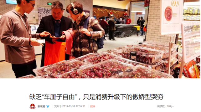 主流媒体则对网友们的“缺乏车厘子自由”称之为消费升级下的傲娇哭穷,国家统计局公布的数据显示,2018年全国居民人均可支配收入28228元,比上年名义增长8.7%,扣除价格因素实际增长6.5%,快于人均GDP增速。近年来我国基尼系数总体呈下降趋势,居民收入差距逐步缩小,作为年轻人调侃式财务自洽的“车厘子自由”,正是在消费升级的语境中,很多人中高端消费需求正日趋旺盛的反映。