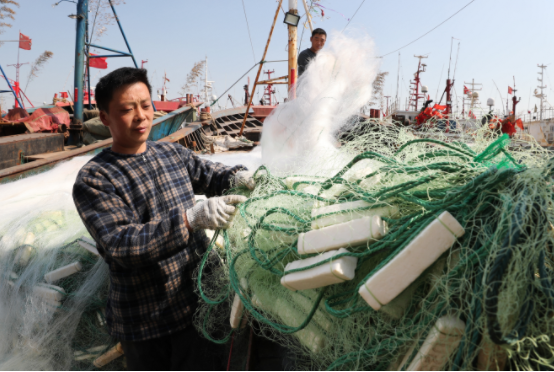 3月15日,渔民们在江苏连云港市赣榆区青口港渔业码头整理渔具,为出海春捕做准备。