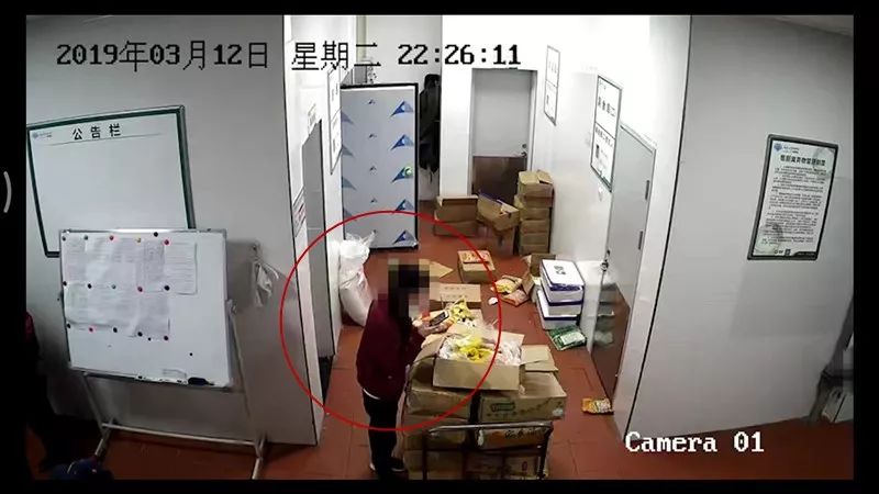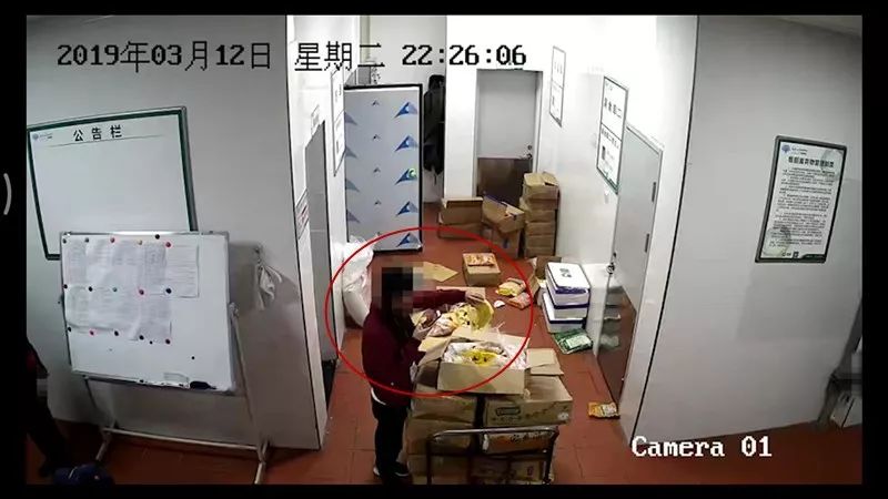 红星记者看到。食堂库房内的一处监控画面显示,12日晚19时12分,工作人员开始打开冻库,将其中的食材一箱箱搬出,放到一个小型平板推车上,准备移出运离,有部分食材被堆放在推车旁的地面上。19时18分,另有一名女性工作人员对现场搬出的食材进行着清点。