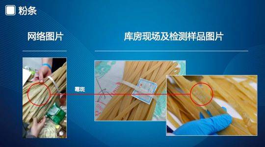 第六组是粉条照片。左边是网络流传的有霉斑的粉条照片;右边是库房及检测机构实验室拍摄的粉条照片。经专家和四川源坤国科质量检验有限公司检测人员鉴定,粉条表面有肉眼可见的霉斑,检验结果为不合格。