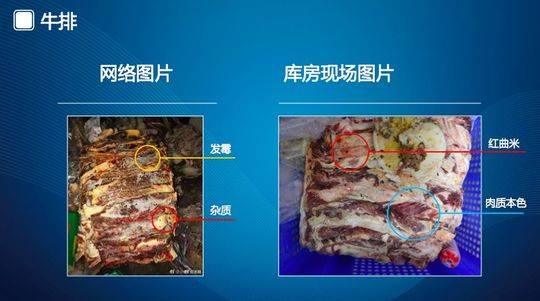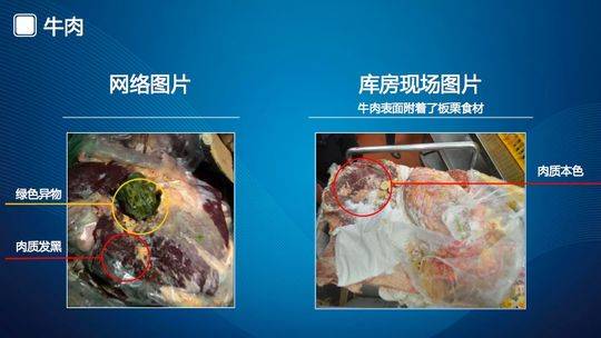 第二组是牛排照片。左边是网络流传的所谓发霉、有杂质的牛排照片;右边是拍摄于学校冻库的牛排照片。可以看到,右边照片清楚显示,牛排表面没有发霉,所谓“杂质”实际上是红曲米。右上角的白色物为肉夹馍。