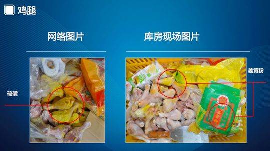 第三组是鸡腿照片。左边照片是网络流传的使用了硫磺的鸡腿;右边照片清楚显示,鸡腿表面的黄色粉末实际上是姜黄粉,根本不是硫磺。