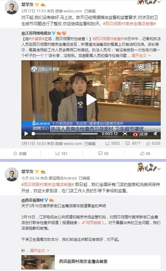 而另一家餐饮品牌企业“西贝莜面村”在被曝光存在餐具洗不干净、食品半成品与清洁工具混放等情况后,于3月18日凌晨在官方微博发声,称“深感抱歉和惭愧”,并表示全国所有门店的厨房和洗碗间保持开放。西贝莜面村副总裁楚学友也通过其个人微博先后两次做出回应,对门店存在的问题致歉,并且表示已经对门店涉及的卫生问题进行了整改。