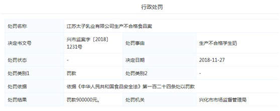 这并非江苏太子乳业首次出现质量问题。据《新京报》报道,天眼查显示,早在2016年10月,江苏太子乳业就曾因违反食品质量监督管理行为,被兴化市市场监管局处以罚款5万元。2018年11月,该企业还因生产不合格食品,而被兴化市市场监管局处以罚款90万元。
