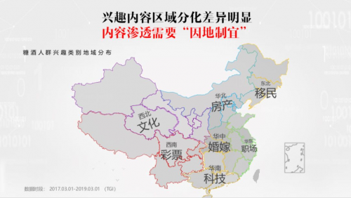 不同于其他行业,因不同地区的风土人情及饮食特色差异化明显,糖酒食品行业地域细分化更加凸显,同时也导致了营销内容的渗透需要更加“因地制宜”。其中,西北地区注重“文化”内容,华南地区对“科技”更感兴趣,华北则是“房产”的重要关注者。