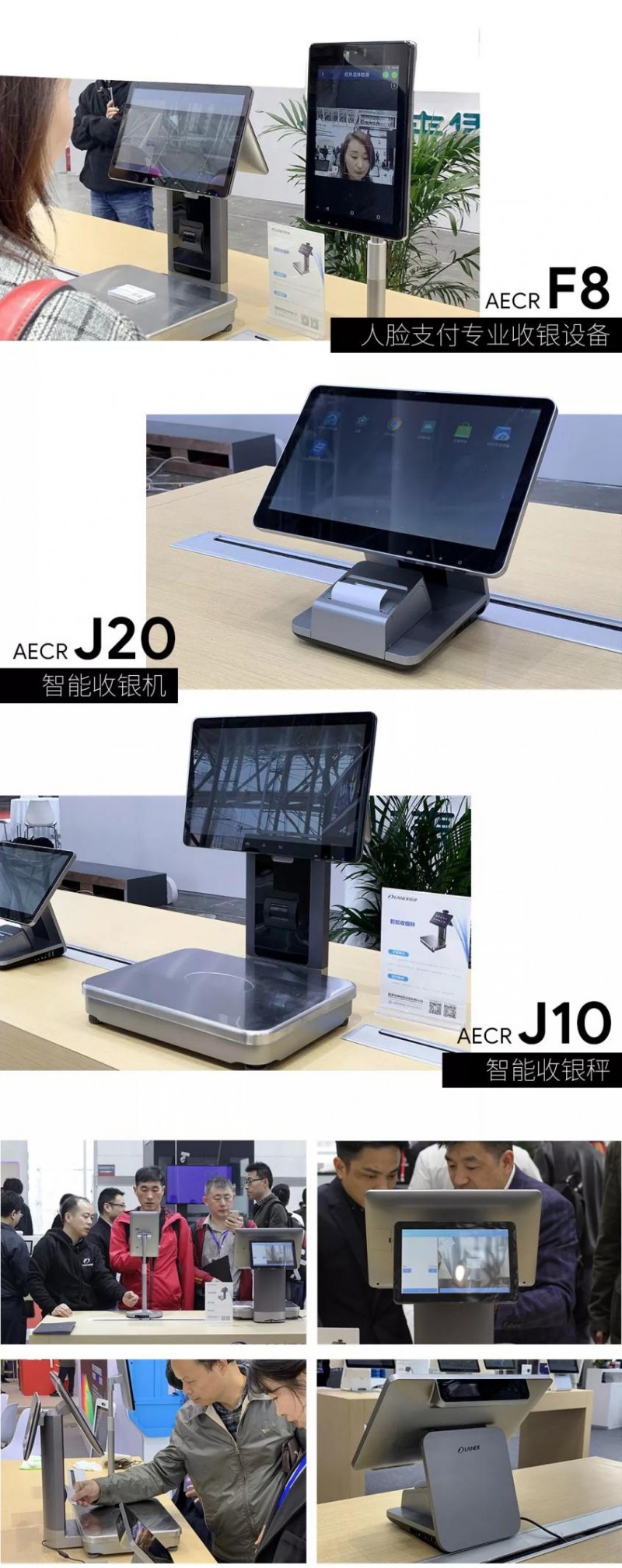 人脸识别技术的运用,是联迪商用此次展出多款新品的一大看点,包括:人脸支付专用收银设备AECR F8,为专柜收银设计的智能收银机AECR J20,带人脸识别摄像头的智能收银秤AECR J10等。