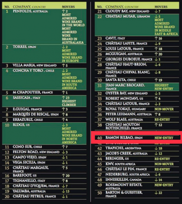 里奥哈排名前位的Ramon Bilbao酒庄入围全球最受尊崇葡萄酒品牌前50强