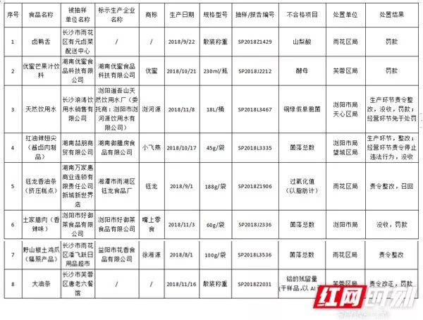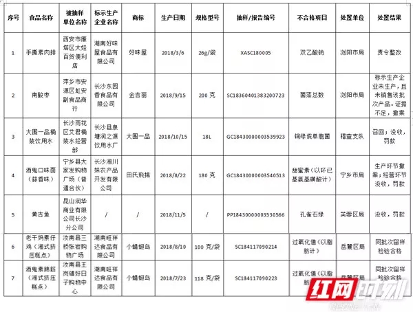 其中长沙东园香食品有限公司金吉丽南酸枣、长沙湘川妹农产品开发有限公司生产的田氏飛揚酒鬼口味面(蒜香味)、湖南旺祥达食品有限公司生产的小蜻蜓岛老干妈素仔鸡(湘式挤压糕点)以及酒鬼素蹄筋(湘式挤压糕点)等榜上有名。不合格项目涉及双乙酸钠、菌落总数、铜绿假单胞菌、甜蜜素(以环已基氨基磺酸计)、过氧化值(以脂肪计)等。部分名单如下: