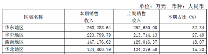 报告期,公司销售占比前四大销售区域为华东、华中、西南、华北,销售占比分别为32.34%、27.49%、18.07%、15.33%。可见这些区域仍是六个核桃营业收入的主要来源。