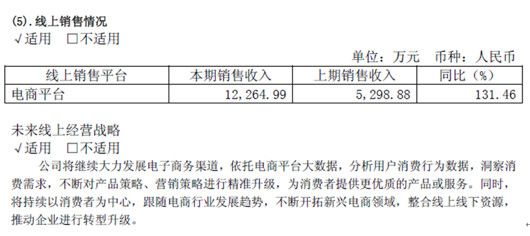 此次财报显示,电商平台本期收入突破12264.99万元,同比增长131.46%,未来将继续大力发展电子商务渠道。