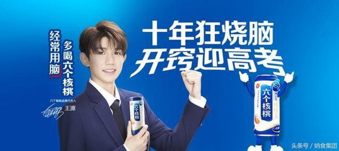 六个核桃先后赞助了《最强大脑》、《诗书中华》、《向上吧!诗词》等热门综艺栏目,将品牌理念渗透到年轻受众群体。同时,六个核桃签约人气偶像王源,通过“高考季”、“开学季”等主题推广活动,将品牌年轻时尚的形象融入一、二线消费群体。