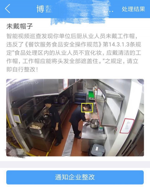 “睿眼”AI远程监管系统识别到后厨员工未戴帽子的违规行为
