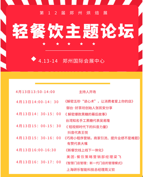 展会现场将同期举办轻餐饮品牌发展主题论坛、轻餐饮品牌市集、软欧包制作技术教学培训、3D萌宠制作技术教学培训、甜品摆台赛、DIY制作大赛等活动异彩纷呈,期待您莅临到会参观!为了进一步提升观众的参观效率,打造一个舒适、便捷、最具价值的烘焙之旅,小编特别为大家准备了本届郑州烘焙展为期2天的同期活动的具体安排,以便于您更好的参观郑州烘焙展。