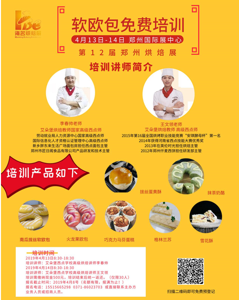 郑州烘焙展携手郑州艾朵堡西点西餐教育举办的展示为期两天的软欧包技术教学培训,免费名额仅剩8个,报名即有机会与得到名师一对一指导交流与学习。