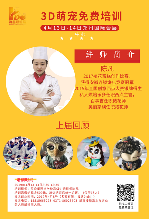 展会现场郑州烘焙展携手郑州艾朵堡西点西餐教育举办的为期2天的3D萌宠制作技术教学培训将于 4月13日正式开始,参与报名即有机会学习最具个性3D萌宠蛋糕制作方法。