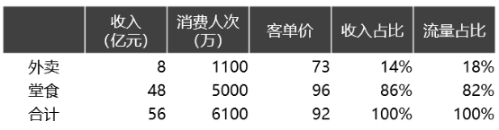 据公开媒体报道,我们把2018年西贝主要经营数据做了下面这张估算表。(公开数据:西贝2018年收入56亿,其中外卖收入8亿;另,堂食约5000万人次,外卖约1100万次订单)