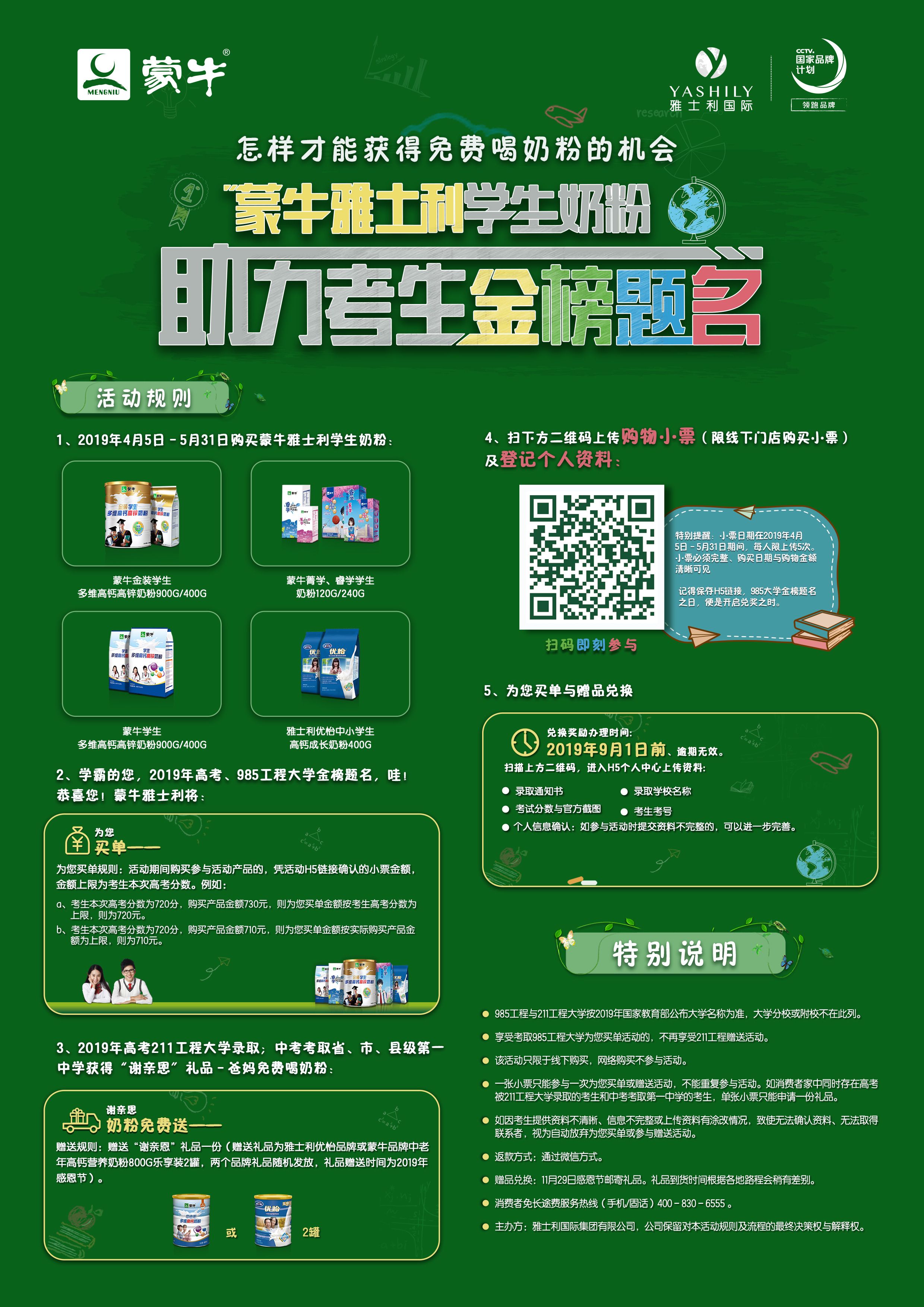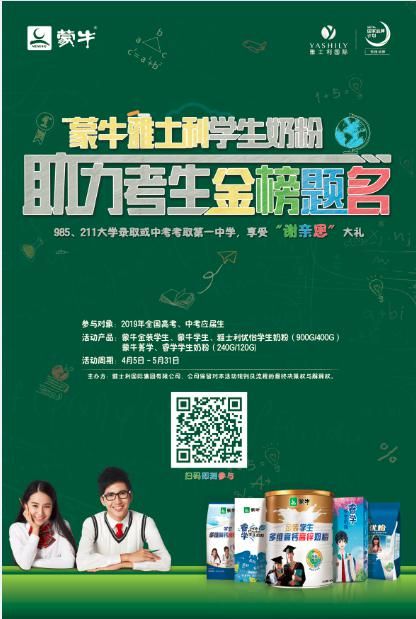 在2019年4月5日-5月31日活动期间,只要在线下各终端门店购买蒙牛、雅士利学生奶粉,扫描活动H5二维码上传购物小票并登记其他资料,即可成功参与活动!待你成功考取985高校之时,雅士利国际将为你的奶粉买单!此外,雅士利国际还为考取211高校及考取县、市、省级第一中学的中考生,精心准备了“谢亲恩”礼品,用以答谢耗费心神一路“陪跑”的父母们。