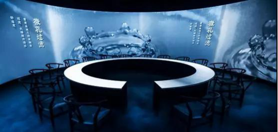 这个墙板被品牌方称为“暗箱”。走进暗箱内部,记者看到的是一个360度投影环幕,中间摆放着一个圆桌。场内有屏风、园林设计,整个风格呈现代新中式。坐下后,投影环幕会播放颇为精致的画面讲述开山的品牌精神、产品故事,同时由侍酒师带领品鉴开山旗下的三款产品。值得一提的是,暗箱内还有用开山白酒做成的香气喷雾。让人从听觉、视觉、嗅觉、味觉多维度体验开山的产品。