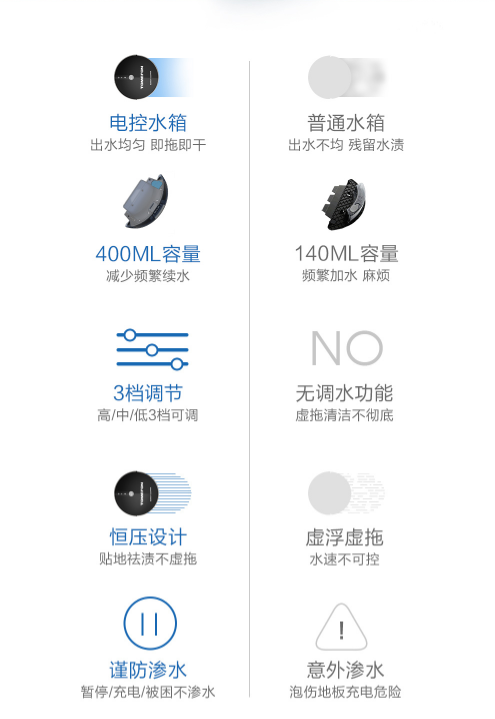 有许多家庭在购买之前不会仔细的看说明,造成盲目或者跟风购买,导致使用一段时间之后才发现各种繁琐的问题。而这款扫地机器人细节处理的特别好,所谓细节决定成败,说的就是它了。对于这种拖扫合一机器人的相信大多数人最担心的就是它会不会漏水。不会!这款智能扫地机器人和普通的水箱有所不同的是,它是电控水箱,和以往的小容量水箱相比,它拥有400ml的容量,既可以均匀出水,又避免了频繁蓄水。所以当扫地机器人暂停,充电和被困的时候,它完全不会渗水,解决了由于渗水泡地板而造成充电危险的隐患,这款扫地机器人是实实在在的为用户考虑。
