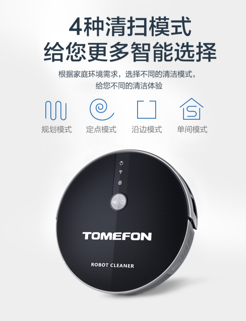 除此之外,许多用户烦恼的清洁模式和清洁力度也得到了保障,除了有高容量的水箱之外,斐纳TOMEFON-TF-MX80智能扫地机器人还有600ml的大尘盒,在容纳更多垃圾的同时,也减少了频繁倒垃圾。而且它还专门设计了4种清洁模式:规划模式,是呈现出贪吃蛇的行走路线;定点模式,是呈现螺旋状的清扫路线;沿边模式,是针对对于房子边缘,藏有灰尘的隐蔽处;单间模式就是对于整个房间的彻底清扫。用户可以根据自己的环境需求,设定不同的清洁路线。这样一来,对于不同种类和大小的垃圾,设置不同的模式,清扫起来,全都不在话下。因此它可以适用于家庭办公等各种场合。