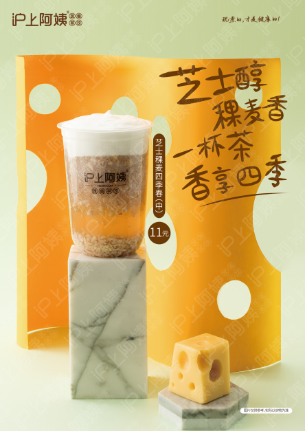 沪上阿姨的另一创新即是推出“奶盖茶饮+谷物”,芝士稞麦四季春这款新品,清香四季春茶巧妙搭配浓香奶盖。茶香沁人心脾,谷物甘甜可口,引领“健康+颜值”新潮流。