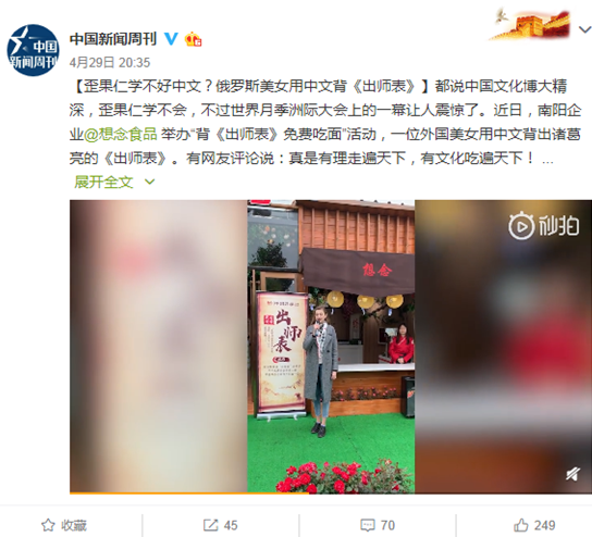 商家推免费午餐,外国美女中俄双语背《出师表》