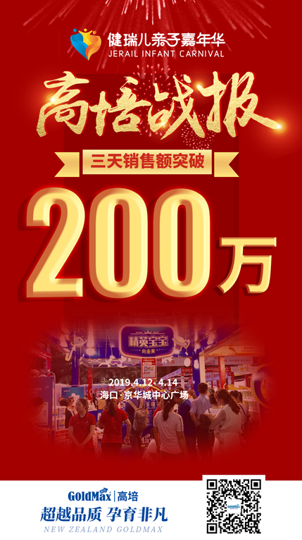 4月14日,海南首个最火爆且长达3天的“健瑞儿孕婴童亲子嘉年华暨10000小时母婴公益”活动正式落下帷幕。连续3天,高培成为全场奶粉销量第一品牌。截至4月14日22点,高培旗下高培臻爱、高培和迪唯恩全系列奶粉总销售额突破200万元,超额完成135万销售目标,达成率高达148%。