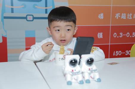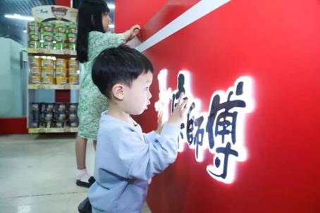 ▲一名参加航天科普活动的小朋友好奇地看着康师傅logo