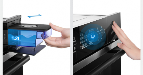 而湿度的调控,主要靠蒸烤一体机的蒸汽动态平衡技术以及外置1.2L触控水箱来实现,蒸汽动态平衡技术能够有效减少冷凝水回滴,同时外置水箱使用户在烹饪中途加水不用打开箱门,更加安全和方便。