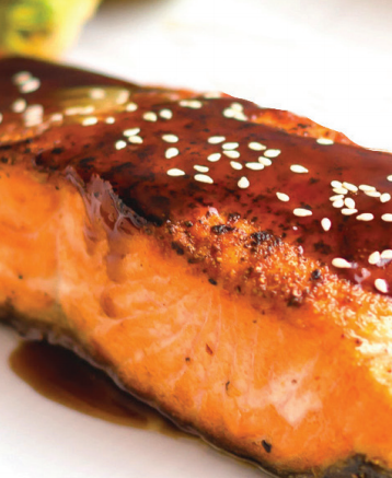 几分钟后,我们就可以戴上隔热手套将烤盘取出,在三文鱼上挤上柠檬汁,淋上芝麻,一道美味的照烧汁三文鱼就大功告成了。
