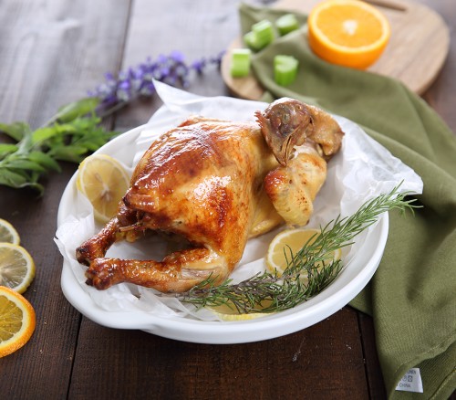 烹饪完成后,取出烤盘,烤鸡焦黄的颜色看着就让人食欲大增。趁热用手撕着吃,淡淡的柠香伴着嫩滑的鸡肉,让吃的人幸福感直线上升。