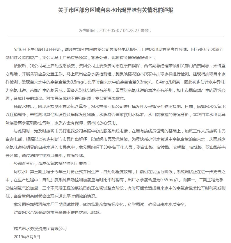 通报称,茂名市水务投资集团有限公司将加强河东水厂三期调试管理,密切监测余氯指标变化,科学调试,确保自来水水质安全。