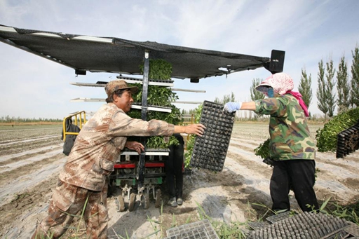 蒲勇章与大伙儿一起利用移栽机种植辣椒苗