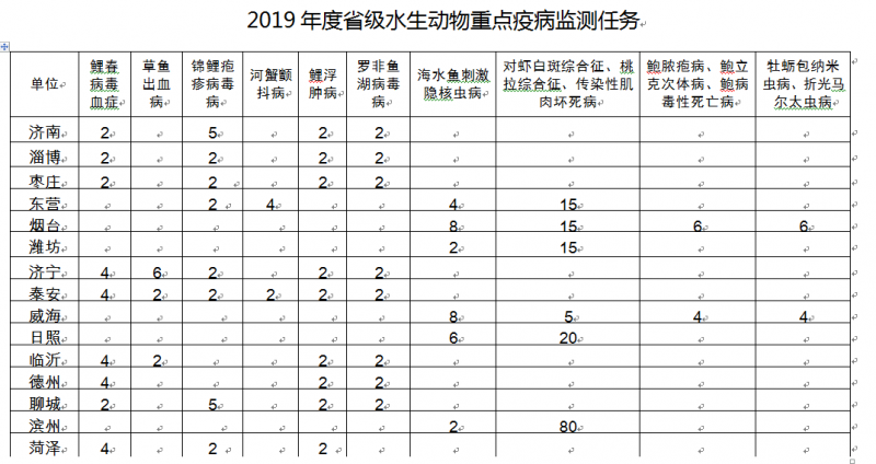 主要对水产苗种产地检疫范围内的山东主导品种进行专项监测,适当增加鲤浮肿病和罗非鱼湖病毒病。