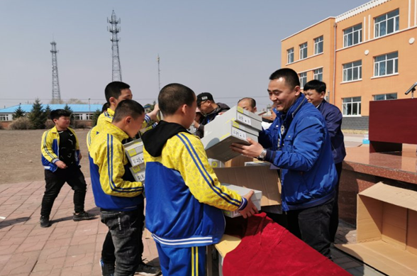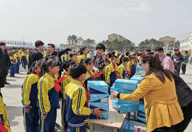 本网讯(高伟)5月10日, 中华儿慈会爱心家园太阳花智联助学团队来到海伦市联发镇中学、联发镇明德小学,分别举行了“让农村留守娃快乐奔跑”捐赠活动,为学生们捐赠了1016双运动鞋,8台套体育器材和16套益智玩具,让孩子们尽享健身运动的乐趣。