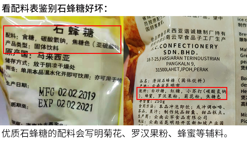 优质石蜂糖是用甘蔗汁加辅料一起熬制,而劣质石蜂糖是用白砂糖融化后加辅料熬制。两者在包装上的配料都是白砂糖、红糖(因为按国家要求,糖制品的原料只能写白砂糖和红糖,不能写甘蔗,这是强行规定),所以光看配料是分不出来的,所以要看实物,甘蔗石蜂糖因为甘蔗批次不同,蜂蜜颜色深浅,熬制时间长短,熬制出的石蜂糖颜色也是从淡黄到棕黄略有偏差,属正宗石蜂糖的特点。而劣势勾兑石蜂糖,是用白砂糖加色素熬制,颜色单一,虽可正常食用,但营养远不如甘蔗石蜂糖。