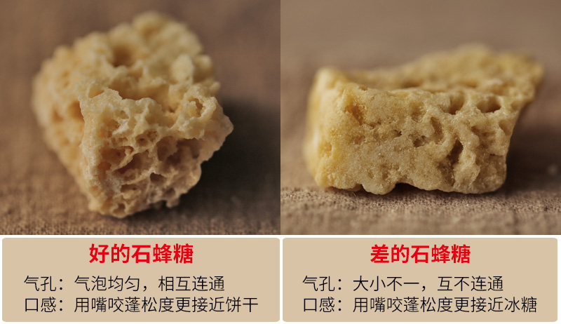 优质石蜂糖气泡均匀,相互连通,用嘴咬蓬松度更接近饼干,而差的石蜂糖气泡大小不一,互不连通,用嘴咬蓬松度更接近冰糖。两者在营养和功效上并无差别,只是使用时泡发速度有别。