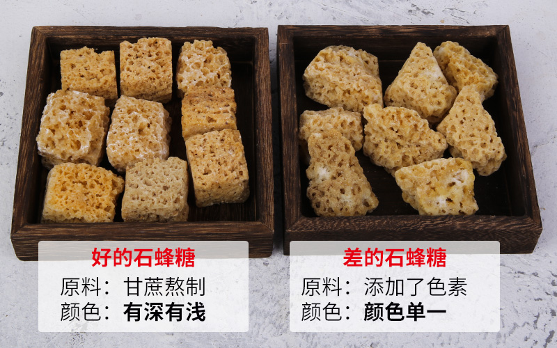 首先,石蜂糖主要成分是蔗糖,本身价格不高,所以没有人会用有害物质假冒石蜂糖,消费者大可放心食用,但是优劣有别。