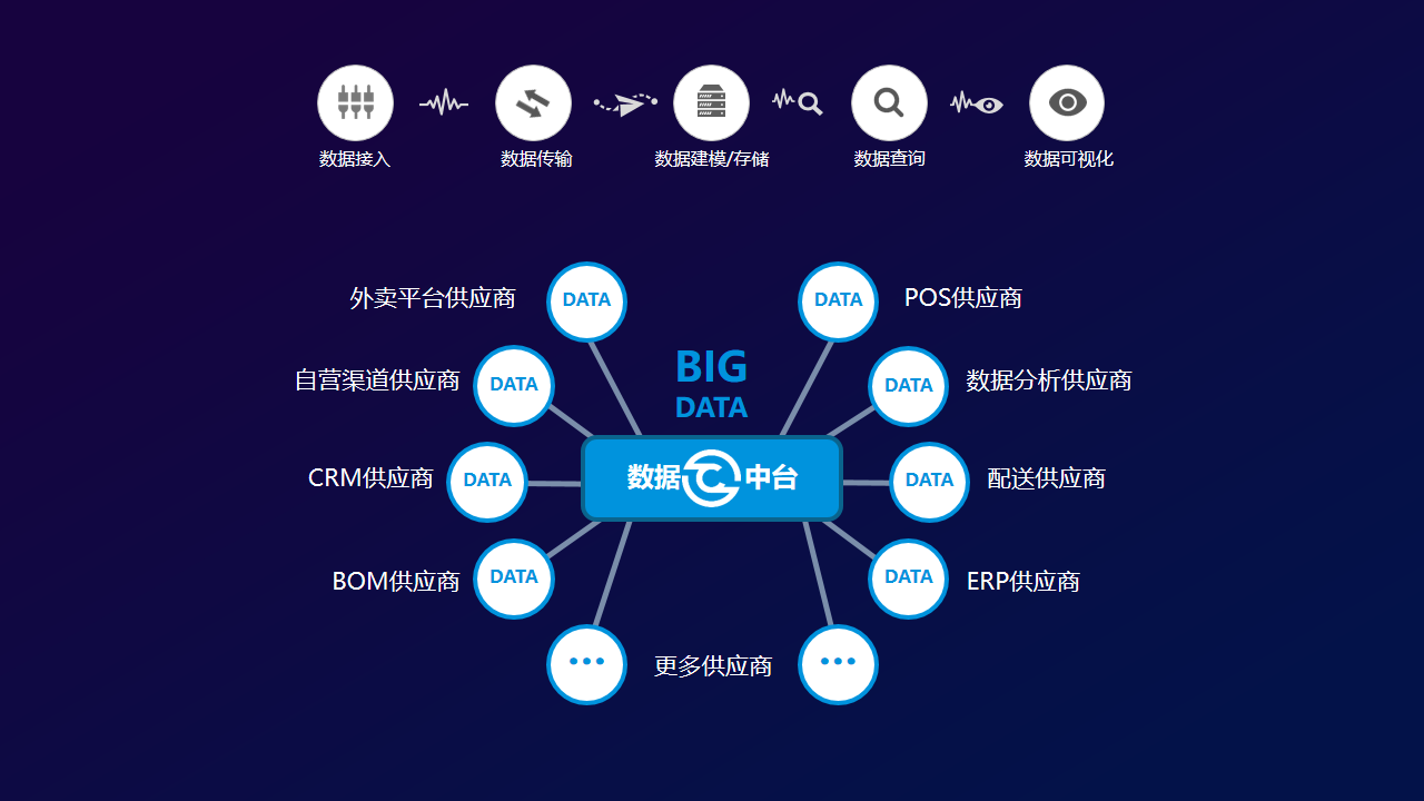 针对现上线下数据融合管理维度,进行全渠道的数据进行分析融合, BI系统实现智能分析,进一步深耕数据,利用数据给商家展开流量的追踪和分析,得出用户的消费分析,比如精细化的用户画像、菜品预测、合理的商圈范围,供商家形成数字决策。